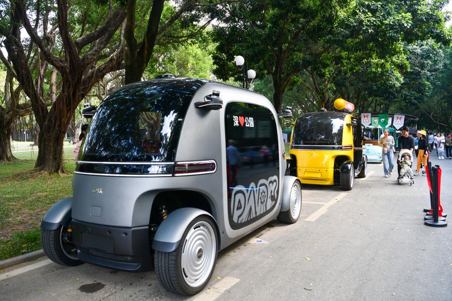 This photo taken on Nov. 11, 2024 shows smart unmanned vehicles at Lianhuashan Park in Shenzhen, south China’s Guangdong Province. (Photo/Xinhua)